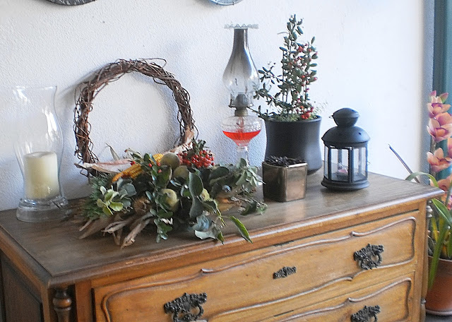 Inspirada pela Velud'arte colhemos umas folhas de figueira, umas astes de marmeleiro, uns mini marmelos, umas folhas de parreira ainda com uns cachos de uva, uns ramos de bagas vermelhas e umas espigas de milho (coisa que os campos por aqui transbordam).